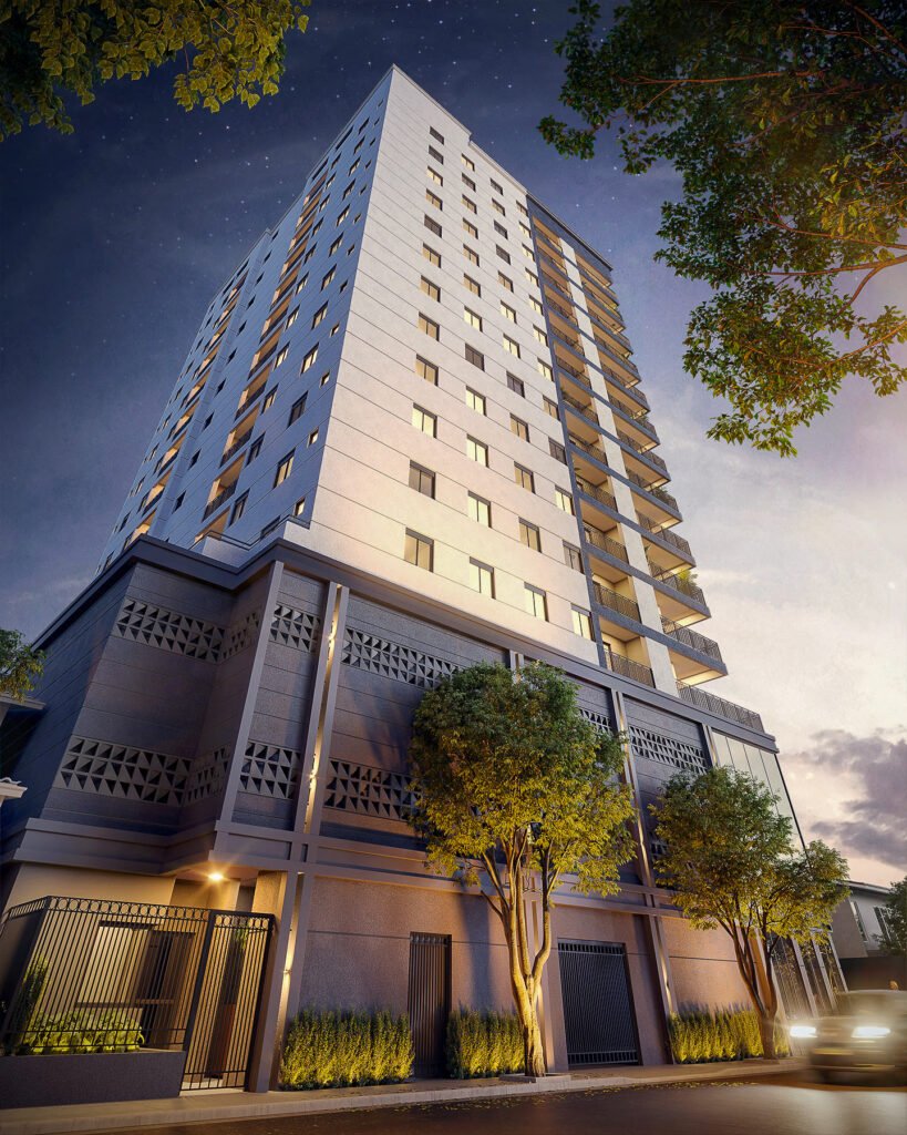 A volumetria contemporânea e a fachada ativa reforçam a integração do edifício com o entorno urbano, contribuindo para a vitalidade do térreo. As unidades de 2 e 3 dormitórios contam com varandas generosas e foram concebidas com distribuição eficiente, priorizando conforto, funcionalidade e qualidade espacial.